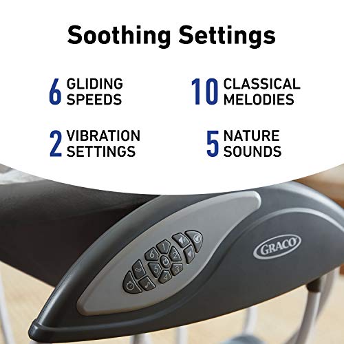 The Graco Glider LX Baby Swing is a unique gliding swing that soothes with the same gentle motion you use when cuddling and comforting baby in your nursery glider. The swings plush, roomy seat with removable infant head and body supports and adjustable recline keep baby cozy, while music keeps baby entertained. Additional features including adjustable gliding speeds, 2-speed vibration, and an overhead toybar help further soothe baby.