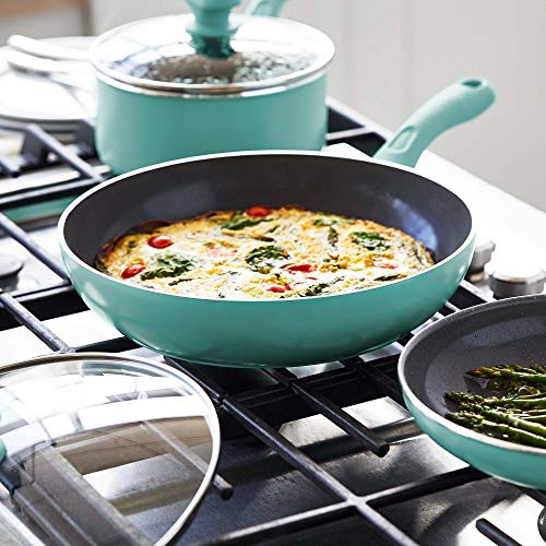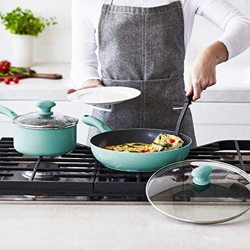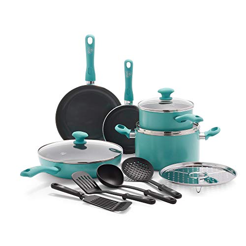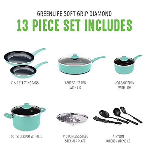 Consider this your anything-and-everything cookware pots and pans set. Our Soft Grip Pro Diamond cookware collection features easy-to-hold, stay-cool handles that help you glide through everyday cooking. Best of all: our healthy ceramic nonstick coating releases even the stickiest foods effortlessly and wipes clean in seconds, no soaking or scrubbing required. This 13-piece pots and pans set covers all your bases, so youre equipped for whatevers on the menu: breakfast, lunch, dinner, and everything in between! And that striking turquoise color? Its a bright spot on any stovetop. Cookware set includes: 7” & 9.5” frying pans/skillets, 2qt saucepan with lid, 3.8qt sauté pan with lid, 5qt casserole/stockpot with lid, 7 stainless steel steamer plate, nylon ladle, nylon slotted turner, and two spatulas.