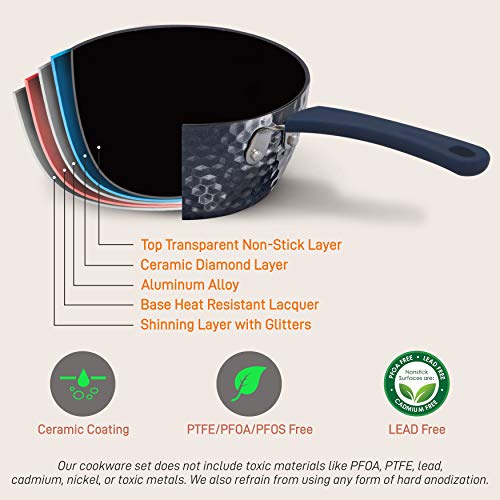 NON-STICK COATING: The non stick pot set cooking ware features a durable and long lasting nonstick coating for easy tossing, cleaning & healthy cooking. Features blue diamond ceramic exterior which makes the pot more durable & w/ better heat transfer