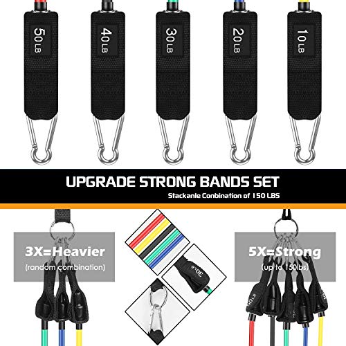 - Adjustable Resistance Bands, Maximum equivalent of 150 lbs – Comes as a set of 5, 48-inch long colored exercise bands: Yellow (10 lbs),Blue (20 lbs), Green (30 lbs), Black (40 lbs), Red(50 lbs). All bands can be combined together to provide up to 150 lbs.